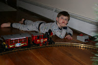 Once Tod had the sled hooked to the rope the boys climbed aboard and off they went. I don't remember the last that I heard so much laughter and giggling...from ALL of them.Later that night, Colin came upstairs while the big boys were playing in the base ment and asked if he could run the Christmas Train. Once he knew that proper technique (you aren't allowed to make it go faster than 2 MPH in either direction unless Daddy is with you), he laid himself down on the floor and became one with the train. Out of all 3 of our boys, Colin has always seemed to show more interest in vehicles and the Christmas Train was no exception. He was on the floor for almost and hour and even went down to get some Lego Minifigures to act as passengers. I hope he doesn't outgrow this anytime soon. Time goes by too quickly and I want him to enjoy this stage for as long as he can...or maybe I want to be the one enjoying this stage..